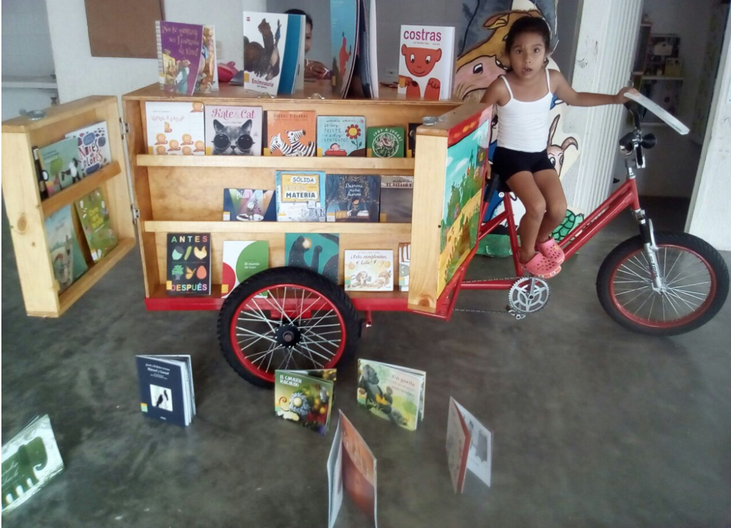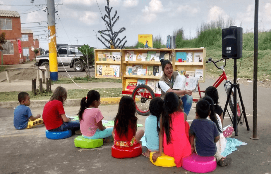 En tres ruedas llegan los libros a diez municipios de Colombia. Un promotor de lectura de la región hace sonar la corneta de su bicicleta invitando a los niños y familias a disfrutar de un momento de lectura y esparcimiento. El particular vehículo abre sus compuertas de madera que están decoradas con una ilustración inspirada en la zona donde se moviliza, y se extiende como un exhibidor que contiene muchos títulos especializados en primera infancia, así como juegos didácticos, cojines y telas.