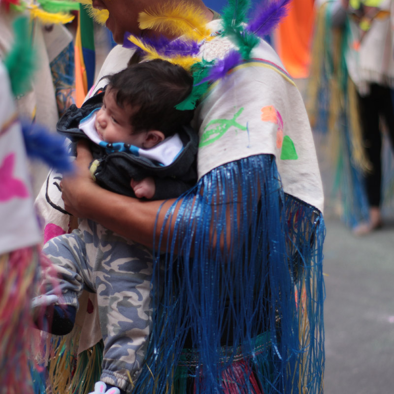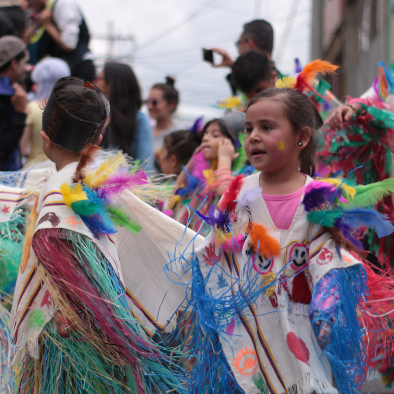 “A raíz de las respuestas de los niños y de sus experiencias en aula comenzamos a elaborar los personajes que hacen parte del carnaval. Algunos salieron de los cuentos, como Elmer el elefante; otros de los talleres de exploración, como el Monstruo de texturas. Los personajes elaborados son una especie de alebrijes, artesanías que representan animales zoomorfos de colores vibrantes. Nosotros, los maestros, somos los entrelazadores de los sueños de los niños, de su imaginación”, dice Daniel con una sonrisa en la boca y la voz agitada después de llegar a la meta final de su comparsa; allí los niños bailaron tonadas ecuatorianas mientras movían sus trajes hechos de miles de retazos de colores.