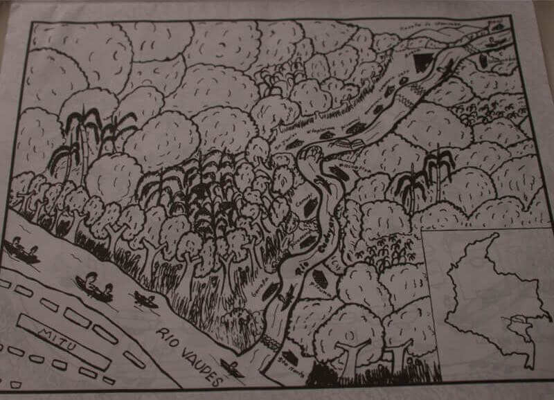 El libro Jūedova Pamiva, Cubeo Cuduyari empieza con una panorámica del territorio; se muestra Mitú, el río Vaupés y su vertiente Cuduyarí. Allí hay una treintena de comunidades asentadas en el río: Santa Marta, Garafa, Pituna, Pirasema, Camutí, Pacoativa, San Javier, Ztapinima, Pirami, Casanare, Pato, Wacurabá y Pacú son algunos de los pueblos que se observan en el papel. Luego, al pasar las páginas, está el Arara y en el interior están sus casas donde ya empiezan a distinguirse elementos propios del pueblo y, por supuesto, la presencia de los niños.