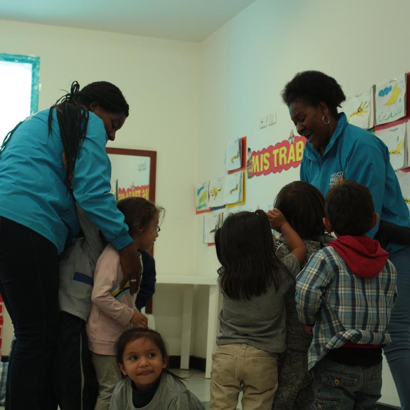Los niños y las niñas apenas las ven se tiran a abrazarlas, empiezan a cantar o las saludan por el nombre de los juegos que ellas les enseñan y que cumplen un rol muy importante para los pueblos afro.