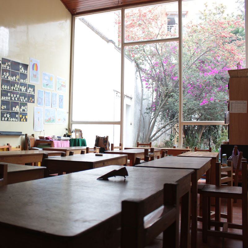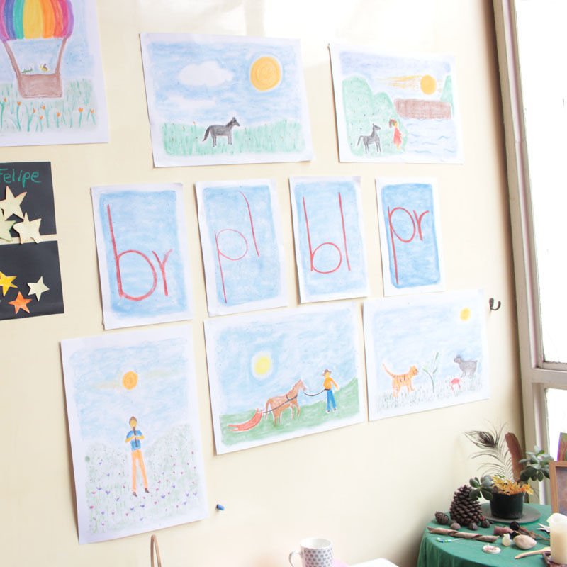 En la otra casa, donde estudian los más grandes, hay tableros plegables en los que se escribe en tiza y frente a ellos hay mesas y sillas de madera. En las paredes cuelgan muchas hojas con dibujos y letras relacionadas con imágenes. Lucía Correa, una de las madres fundadoras del proyecto, cuenta que el conocimiento está asociado a una imagen y a una historia, y que por eso las letras que acompañan el ejercicio de aprendizaje de la lectoescritura se enseñan por medio de dibujos que llevan mucho color.