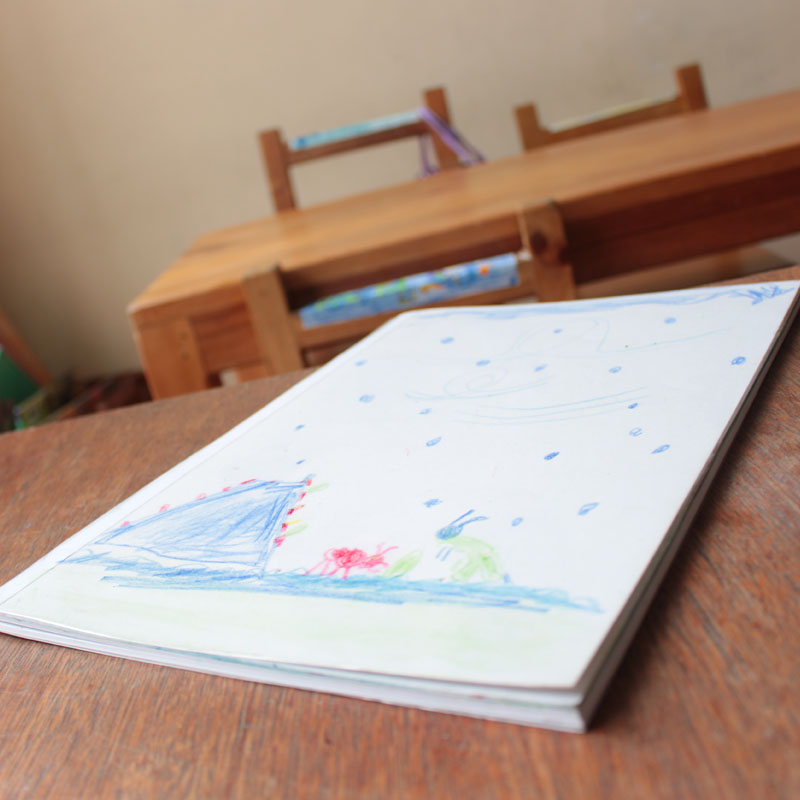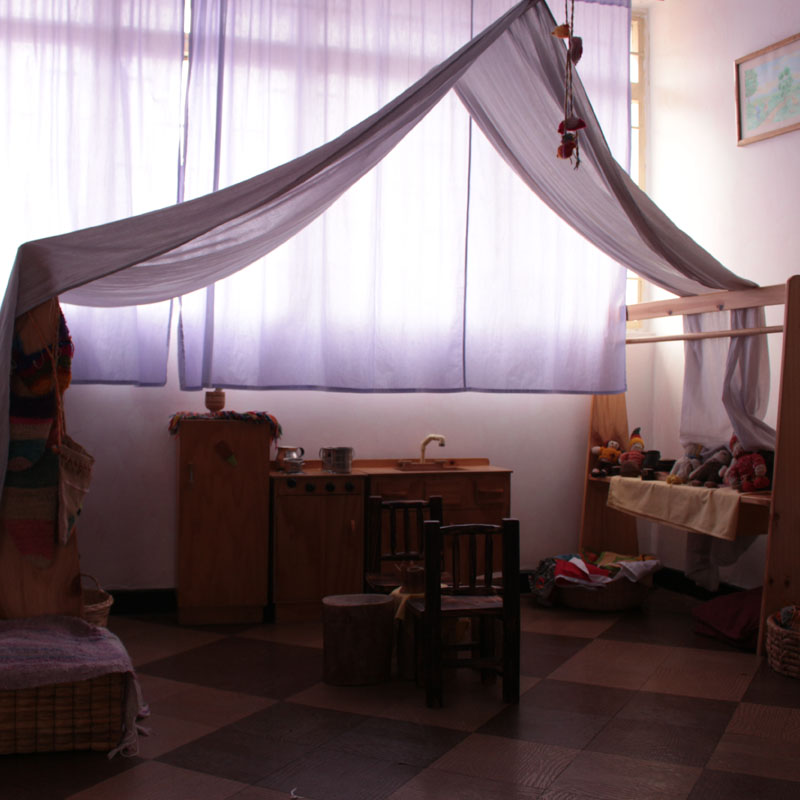 En la estantería donde deberían ir los libros de estudio hay una especie de cuadernos de dibujo que son elaborados por los padres de familia –en Intihuasi no hay libros de texto. Además, en cada salón hay una mesa, una especie de altar con piedras, cuarzos y una planta, así como otros elementos simbólicos que, en el caso de los niños más pequeños, pueden ser una suerte de escudo de caballero de la edad media o incluso una corona.