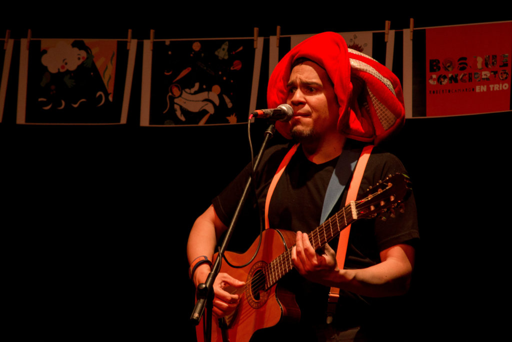 En Bosqueconcierto hacemos una reinterpretación del formato de trío vallenato folclórico que usa la caja, la guacharaca y el acordeón. El otro formato es guitarra acompañante, guitarra puntera y guacharaca. El formato de trío que proponemos trata de reinterpretar, de ser transversal, y por ello reemplazamos el acordeón con la armónica, que nos acerca a la sonoridad del altiplano del país. También hay un trabajo desde el ritmo, para que sean ritmos pegajosos, festivos, bailables, alegres, ritmos colombianos como el bambuco, el paseo vallenato o el chandé. Y con ellos vamos a contar historias… Por ejemplo, Monólogo de una rana que habla sobre la contaminación y el desplazamiento de las especies, así Bosqueconcierto llega a los niños desde lo musical.