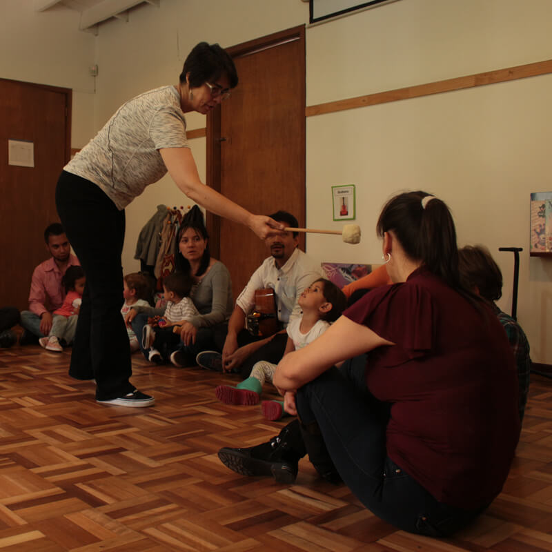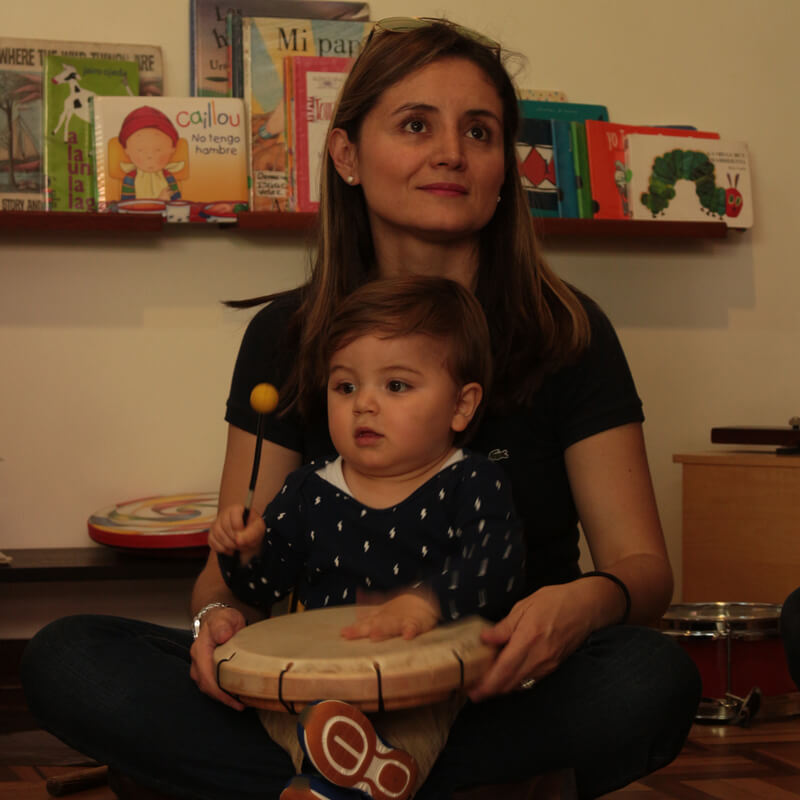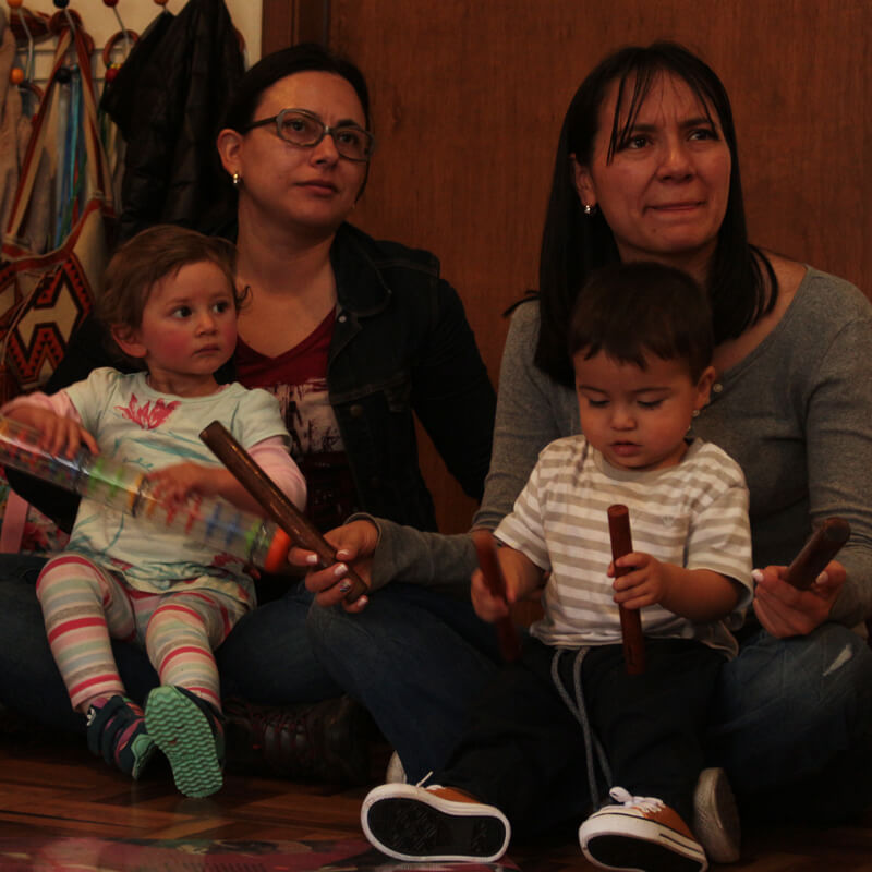 Daniel, el más grande del grupo, entra y mira alrededor. Lo mismo hace Julieta, con sus cachetes rosados; Emiliano, que está muy emocionado toca cada instrumento que encuentra a su paso; y Juanita, que tan solo tiene 8 meses, mira todo y abre sus pequeños ojos –atónita– por la estimulación que recibe al ver tantos niños, sonidos y movimiento. Ellos están acompañados de sus papás y cuidadores. En un círculo todos se sientan en el suelo; algunos prefieren las piernas de sus papás y otros, por el contrario, toman la batuta de la actividad y ayudan a Carmenza Botero, quien dirige el taller.