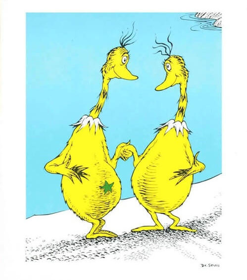 Un día, un extraño llega con una máquina fantástica que crea estrellas y los que no tenían se las ponen en las barrigas, pero, justo, los que ya tenían estrellas deciden quitárselas para seguir diferenciándose de los otros. Al final, una y otra vez, los Sneetches se quitan y se ponen las estrellas perdiendo, en el paso a paso, todo su dinero y confundiéndose de quienes se querían diferenciar.