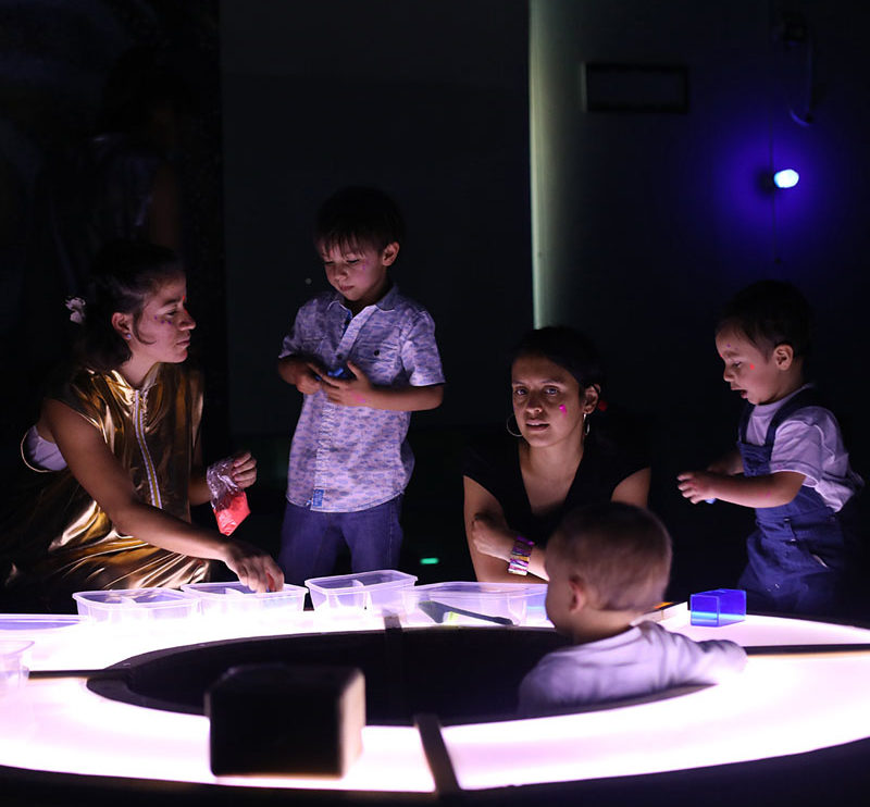 Este espacio está inspirado en el universo y en la posibilidad que el cosmos brinda para que los niños piensen, disfruten y vivan dos fenómenos físicos: la oscuridad y la luz.