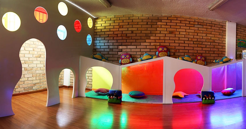 La madera es uno de los componentes que está presente en todo el espacio e invita a un juego de entradas y salidas, de perspectivas, de alturas y de formas en las que los niños pueden traspasar, vivir y apropiar. El segundo elemento que se articula con el espacio y abre las posibilidades de juego y exploración es la luz: hay ventanales de colores y paredes que cambian de color, lo que genera múltiples atmósferas y ambientes que se entrelazan.