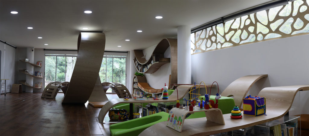 La Biblioteca El Parque (en alianza de Biblored y el programa Nidos – Arte en Primera infancia del Idartes) es, sin lugar a dudas, un espacio adecuado para los niños de primera infancia. Los libros fluyen por los estantes que parecen ramas de los árboles y las formas orgánicas del diseño plantean un juego creativo en el que los niños pueden explorar y descubrir todas las posibilidades que el espacio ofrece. El lugar está lleno de espirales de madera y muebles rojos, verdes y amarillos; los estantes suben y bajan y los libros parecen moverse entre las paredes.