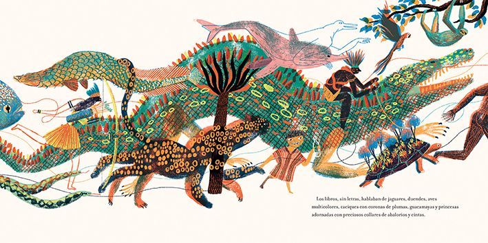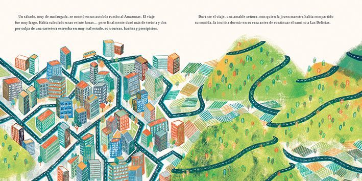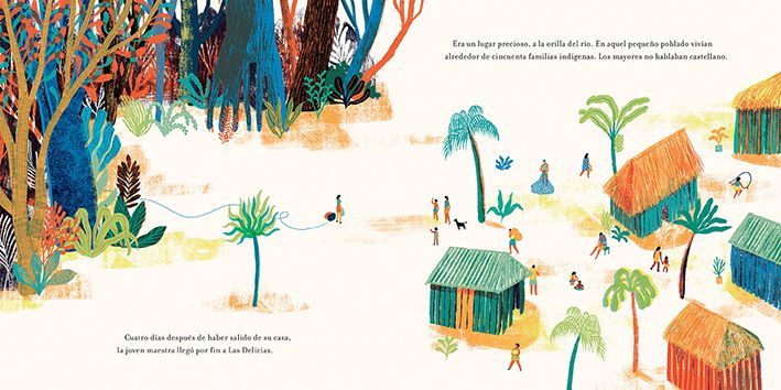 La joven maestra tiene un destino: a selva. ¿Quién no ha estado frente a un reto, decisión o cambio en la vida? Este personaje, que no tiene nombre propio, no es María o Juana, sino la joven maestra, es único pero también múltiple. Es una maestra y al mismo tiempo es todas. La selva empieza a invadir las páginas desde el principio, como otro personaje que siempre está presente. El camino se va transformando de gris a verde. La inmensidad del Amazonas hace su aparición. Vemos a la maestra, llegar a un lugar inhóspito y se ve pequeñita, en medio de tanta grandeza. Es un libro que habla. Un detalle en la imagen lleva a otra historia, un hilo aparece y cuenta. La serpiente es metáfora en esta historia que guarda un reflexión sobre la relación entre los seres humanos y sus ecosistemas. Las leyendas, pero sobre todo el tejido creado en comunidad, sobrevive y se fortalece.